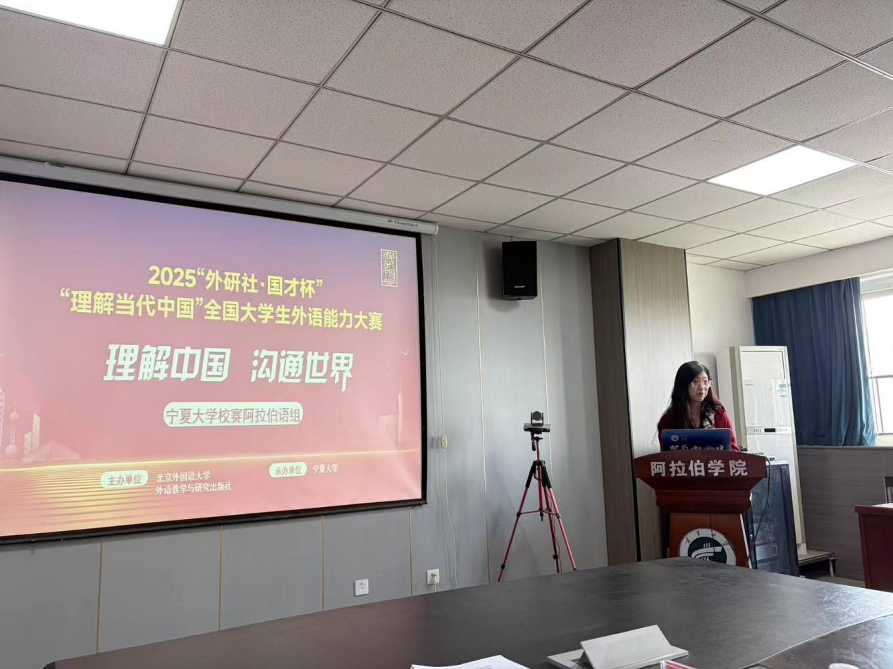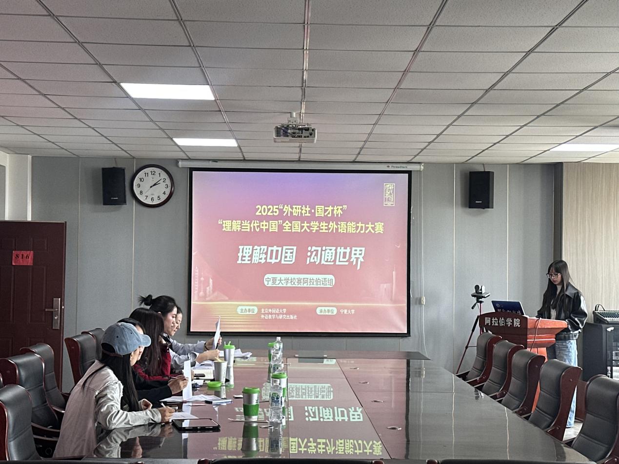 2025年9月26日下午2点,宁夏大学阿拉伯学院(中国阿拉伯国家研究院)在怀远校区怀远楼816教室举办了2025“外研社•国才杯”“理解当代中国”全国大学生外国语能力大赛宁夏大学校赛阿拉伯语组比赛。此次比赛由阿拉伯学院副院长白楠以及阿拉伯学院教师独乐、何祯、王榕、张素素等担任比赛评委。