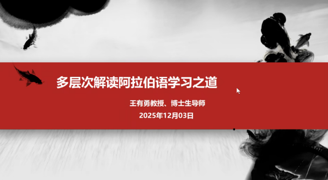 12月3日晚,宁夏大学阿拉伯学院举办“多层次解读阿拉伯语学习之道”线上专题讲座,邀请上海外国语大学翻译研究院院长王有勇教授主讲。讲座由宁夏大学阿拉伯学院副院长白楠主持,学院师生共同参与。